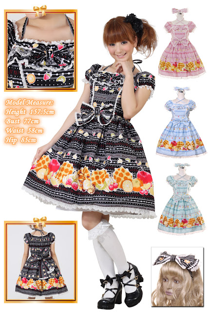 This waffle and fruit themed print is another print that reminds me of some of Angelic Pretty's more recent prints, the ones where they go a bit Emily Temple Cute. There's no directly similar piece to this dress that I can think of, but it certainly does remind me of something along the lines of AP's French Cafe or even Honey Cake, if simply because of the use of a more breakfasty looking print in a styling that is a bit simpler than most AP prints.